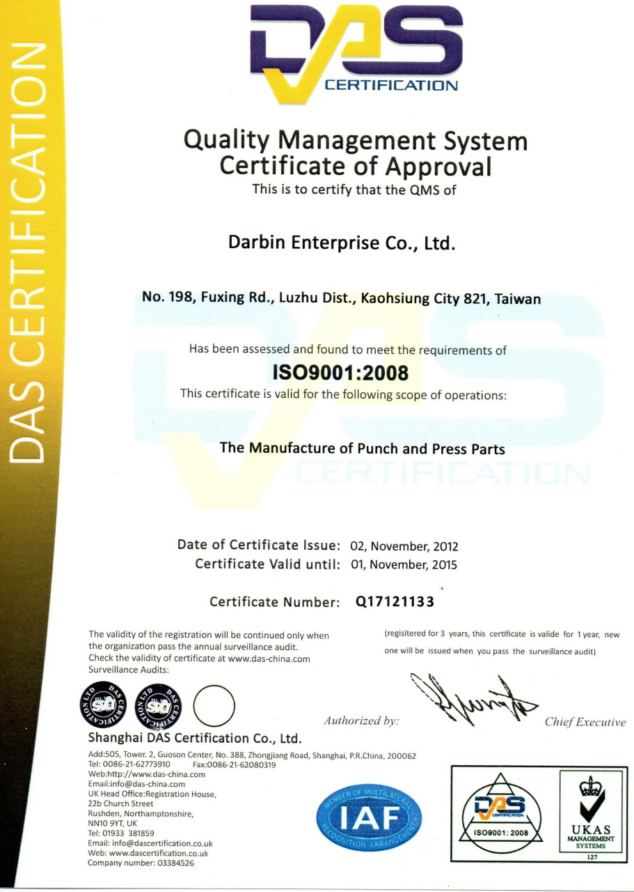 达彬企业拥有ISO9001:2008证照